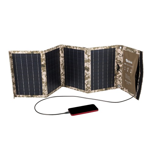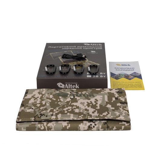 Монокристалічна сонячна панель ALTEK ALT-28 потужністю 28Вт з трьома виходами USB є оптимальним варіантом для мандрівників, рибалок, мисливців і всіх кому важливо мінімальна вага та компактні розміри при максимальній ефективності. За допомогою даної панелі можна заряджати павербанки, смартфони, смарт годинники, без дротові навушники та інші малопотужні пристрої. Панель дуже компакта та легка, без проблем можна покласти її у внутрішню кишеню рюкзака, кофр мотоцикла і навіть в розкладеному стані не займе багато місця в надувному човні.