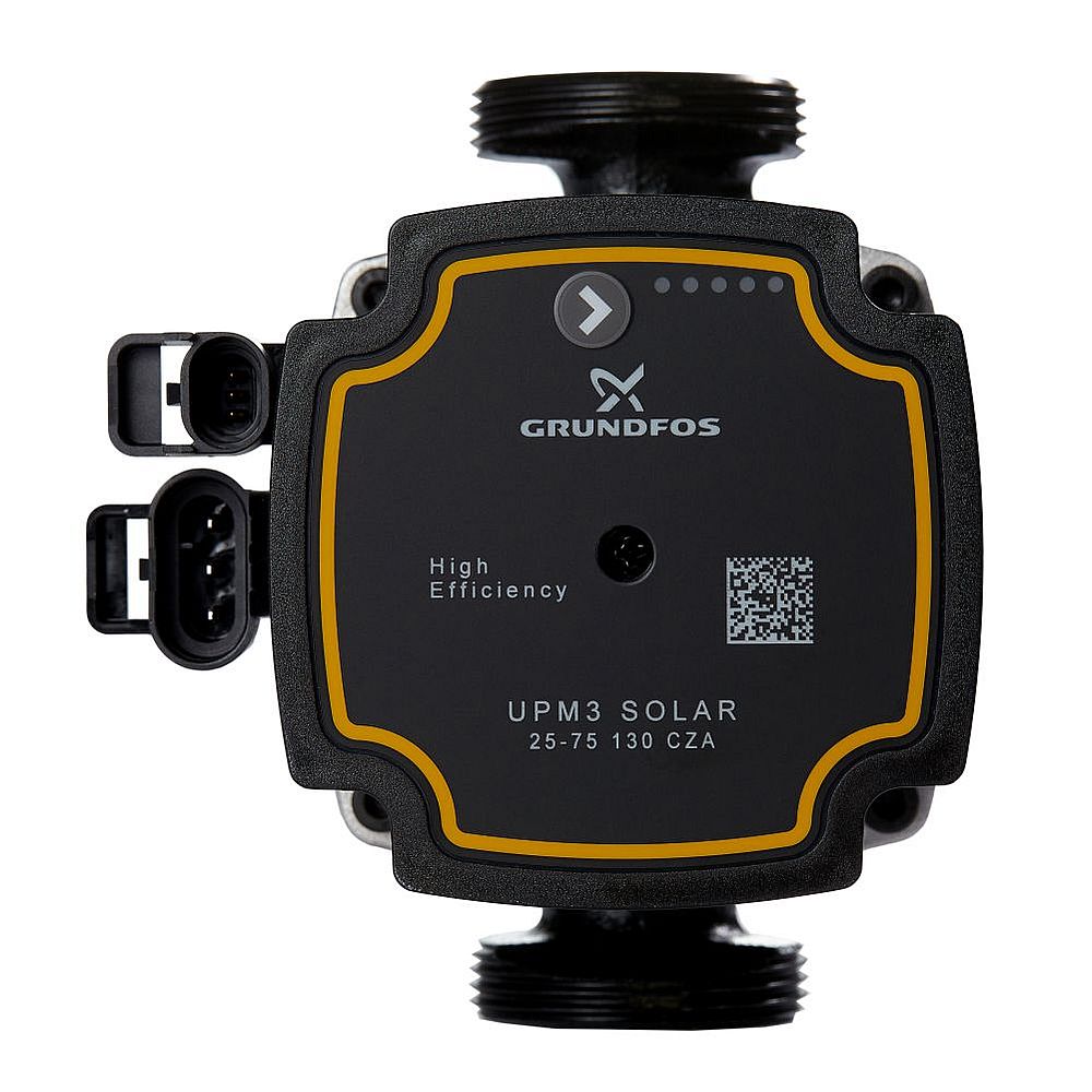 Насос Grundfos UPM3 Solar 25-75 випускається у Франції та призначений для роботи в теплових геліосистемах. Дана модель циркулярного насоса з мокрим ротором відрізняється високою ефективністю використання електроенергії та гарною продуктивністю, що робить його одним із найкращих пристроїв для роботи в солярних системах ГВП. Однією з головних переваг даної моделі є можливість підключати зовнішні пристрої управління з ШІМ (профіль С), але також можливість експлуатації в режимі постійної кривої без використання зовнішніх схем управління. Частота обертання має 3 ступені регулювання. Корпус пристрою виготовлений із сірого чавуну, в якому розташований ротор із нержавіючої сталі, що спирається на металографічні підшипники. При цьому власна вага пристрою становить лише 1,9 кг. Для виготовлення робочого колеса використані тільки хімічно інертні та стійкі до високих температур синтетичні матеріали, що забезпечує чистоту рідини, що перекачується. Такий вибір матеріалів та конструктивного рішення дозволяє тривалий час експлуатувати насос без погіршення його технічних характеристик та появи відмов. Розміри установки Grundfos UPM3 Solar 25-75 (довжина) становлять 130 мм. Допускається як горизонтальна, і вертикальна установка. Для підключення до системи застосовуються різьбові з’єднання G1½”. Для спрощення монтажу та підключення до електричних кіл в комплект постачання входять кабель живлення та кабель PWM управління.
