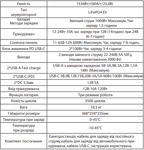 Портативна зарядна електростанція СР1500 має сучасний, найбезпечніший та надійний літієвий акумулятор LiFePO4, ємністю 1075,2 Вт·год, гарантує більш ніж 3 500 циклів заряду при глибині розряду DOD 100%, 7 000 циклів при глибіні розряду 50%, для збільшення тривалості служби). З технологією швидкої зарядки гаджетів Power Delivery та технологією PowerBoost максимальне навантаження тривалий час. Підтримує зарядку від сонячних панелей потужністю 120 Вт (12-30В-6.2А Максимум). Термін експлуатації становить 10 років.
