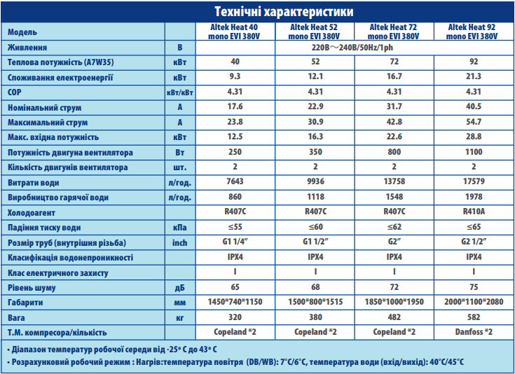 Характеристики теплових насосів Altek  HEAT:
